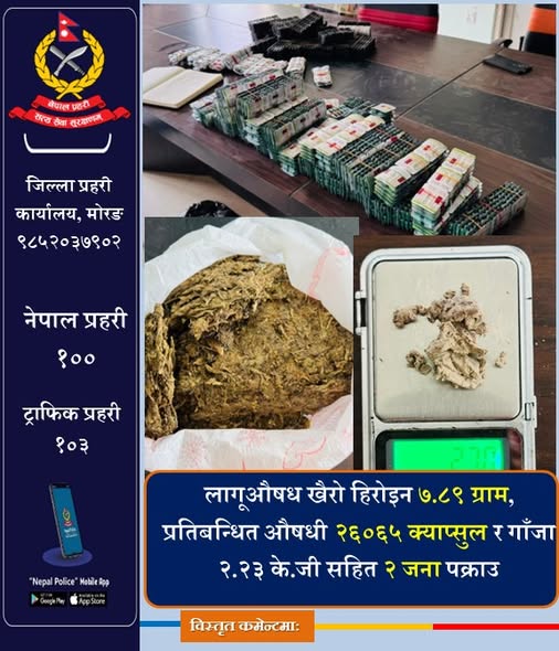 उर्लाबारी (मोरङ), २१ चैत । मोरङको उर्लाबारीबाट प्रहरीले ठूलो परिमाणमा प्रतिबन्धित लागूऔषध र औषधि सहित दुई जनालाई पक्राउ गरेको छ।