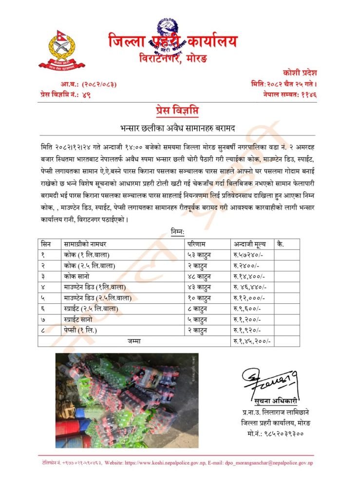विराटनगर, २५ चैत । मोरङको सुनवर्षी नगरपालिकाबाट प्रहरीले ठुलो परिमाणमा भन्सार छलीका अवैध पेय पदार्थहरू बरामद गरेको छ। जिल्ला प्रहरी कार्यालय मोरङले दिएको जानकारी अनुसार सुनवर्षी नगरपालिका वडा नं. २ अमरदह बजारस्थित पारस किराना पसलबाट ती सामग्री बरामद गरिएको हो।