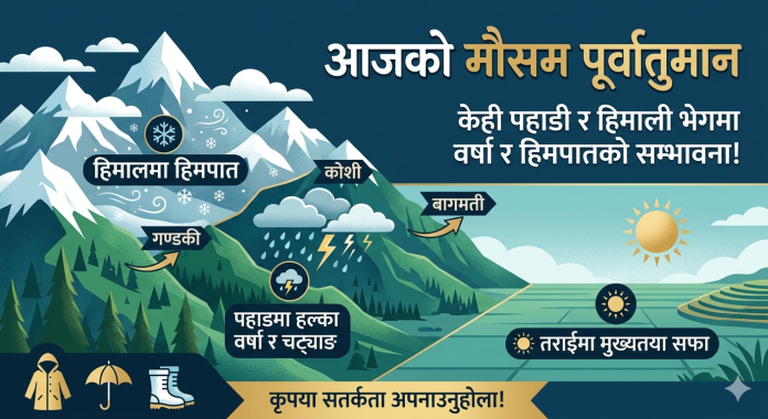 राति कोशी र गण्डकी प्रदेशका हिमाली भेगका थोरै स्थानमा हल्का वर्षा र हिमपात हुनसक्ने पूर्वानुमान छ। अन्य क्षेत्रको मौसम भने सफा रहनेछ।