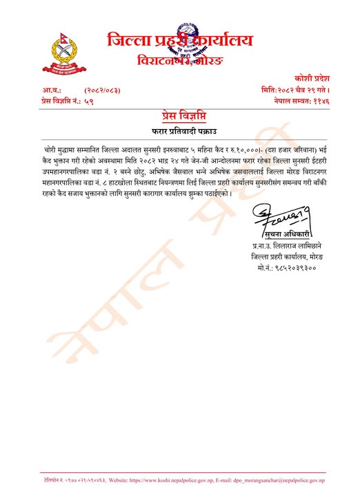 विराटनगर, २९ चैत । चोरी मुद्दामा सजाय पाएर फरार रहेका एक प्रतिवादीलाई मोरङ प्रहरीले पक्राउ गरेको छ । पक्राउ पर्नेमा सुनसरीको इटहरी उपमहानगरपालिका वडा नं. २ बस्ने ‘छोटु’ भनिने अभिषेक जैसवाल (अभिषेक जसवाल) रहेका छन् ।