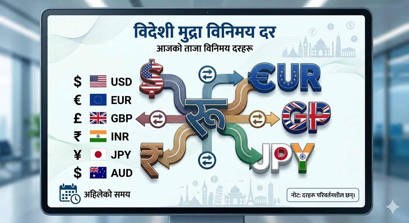 आजका लागि निर्धारण गरिएको विनिमय दर अनुसार अमेरिकी डलर १ को खरिद दर १४८ रुपैयाँ ०७ पैसा र बिक्री दर १४८ रुपैयाँ ६७ पैसा रहेको छ। त्यस्तै, युरोपियन युरो १ को खरिद दर १७३ रुपैयाँ ५४ पैसा र बिक्री दर १७४ रुपैयाँ २४ पैसा तोकिएको छ।