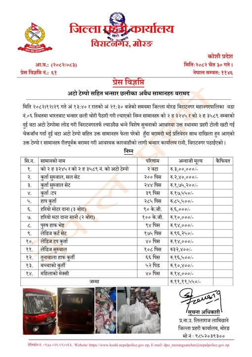 जिल्ला प्रहरी कार्यालय मोरङले विराटनगरका विभिन्न स्थानबाट भन्सार छली गरी ल्याइएका ११ लाख रुपैयाँभन्दा बढी मूल्यका अवैध सामान र दुईवटा अटो टेम्पो नियन्त्रणमा लिएको छ।