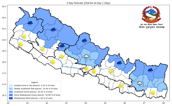 काठमाडौँ, १ वैशाख । विक्रम संवत् २०८३ सालको पहिलो दिन आज देशका विभिन्न भागमा आंशिकदेखि साधारणतया बदली रहने जल तथा मौसम विज्ञान विभागले जनाएको छ। नयाँ वर्षको उत्साहका बीच प्रकृतिले मिश्रित मौसमको संकेत देखाएको छ।