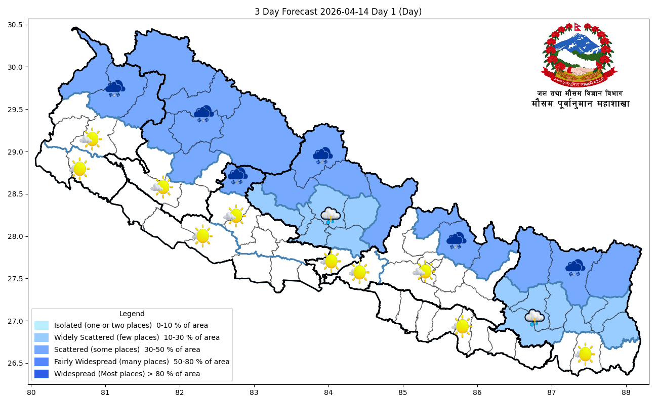 विशेष गरी हिमाली भेगका थोरै स्थानहरूमा र कोशी तथा गण्डकी प्रदेशका पहाडी भू-भागका एक-दुई स्थानमा मेघगर्जन र चट्याङ्गसहित हल्का वर्षा वा हिमपातको सम्भावना रहेको छ। पहाडी क्षेत्रमा पदयात्रा वा घुमघाममा निस्कनेहरूलाई सतर्कता अपनाउन सुझाव दिइएको छ।
