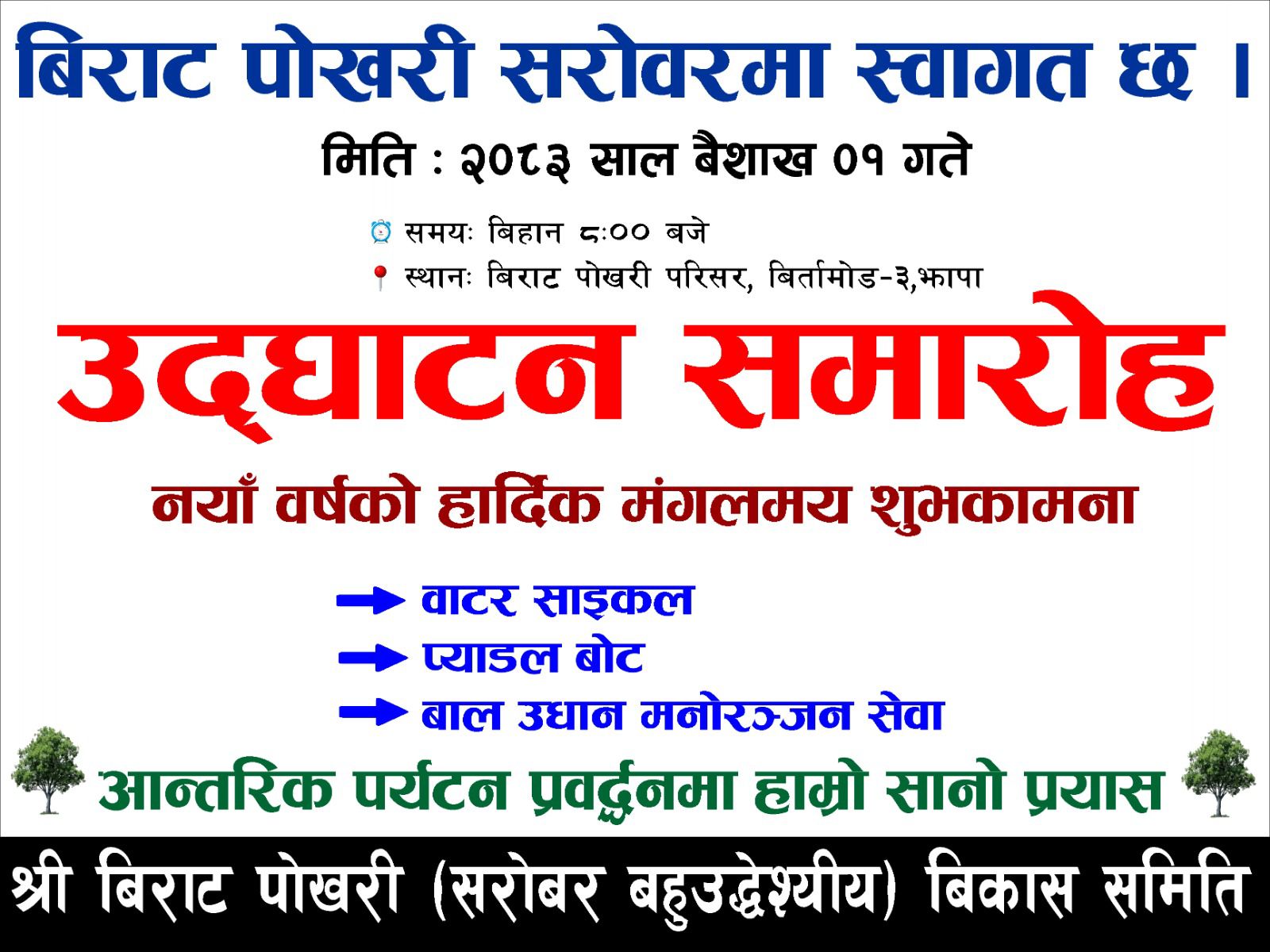 झापाको बिर्तामोड–३ स्थित पर्यटकीय गन्तव्य बिराट पोखरीमा नयाँ वर्ष २०८३ को अवसर पारेर बोटिङ तथा बाल उद्यान सेवा औपचारिक रूपमा सुरु भएको छ। श्री बिराट पोखरी (सरोबर बहुद्देश्यीय) विकास समितिले वैशाख १ गतेदेखि नै यी मनोरञ्जनका सुविधाहरू सञ्चालनमा ल्याएको हो।
