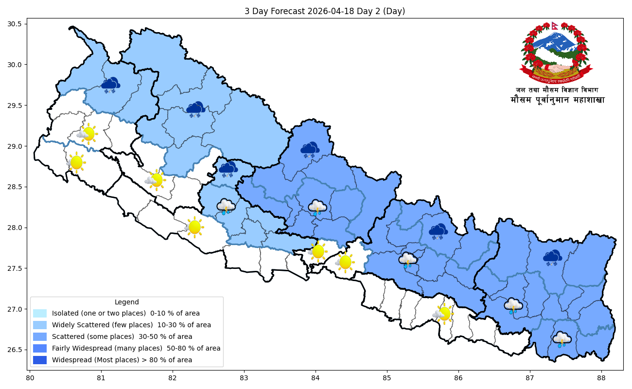 आज दिउँसो कोशी, बागमती र गण्डकी प्रदेशको पहाडी र हिमाली भू-भागमा साधारणतया बादल लाग्नेछ। मधेश प्रदेश लगायत बाँकी पहाडी भेगमा आंशिक बदली रहे पनि अन्य तराई क्षेत्रमा मौसम मुख्यतया सफा रहनेछ। कोशी, बागमती र गण्डकीका थोरै स्थानहरू तथा लुम्बिनी, कर्णाली र सुदूरपश्चिमका पहाडी र हिमाली भू-भागका एक-दुई स्थानमा मेघगर्जन र चट्याङ्गसहित हल्का वर्षा वा हिमपातको सम्भावना छ।