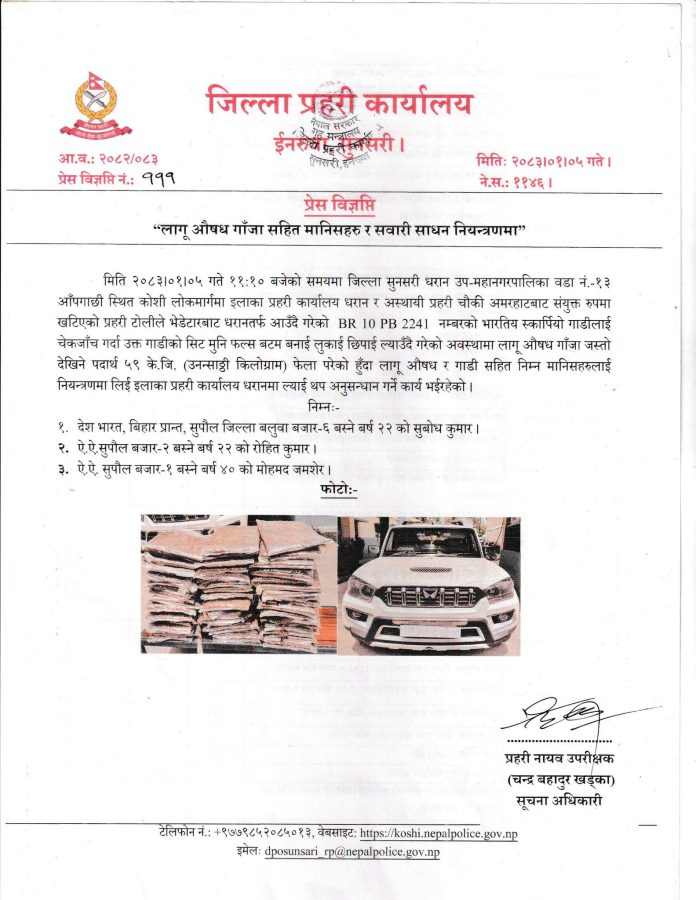 धरानमा भारतीय गाडीबाट ५९ किलो गाँजा बरामद, तीन भारतीय नागरिक पक्राउ